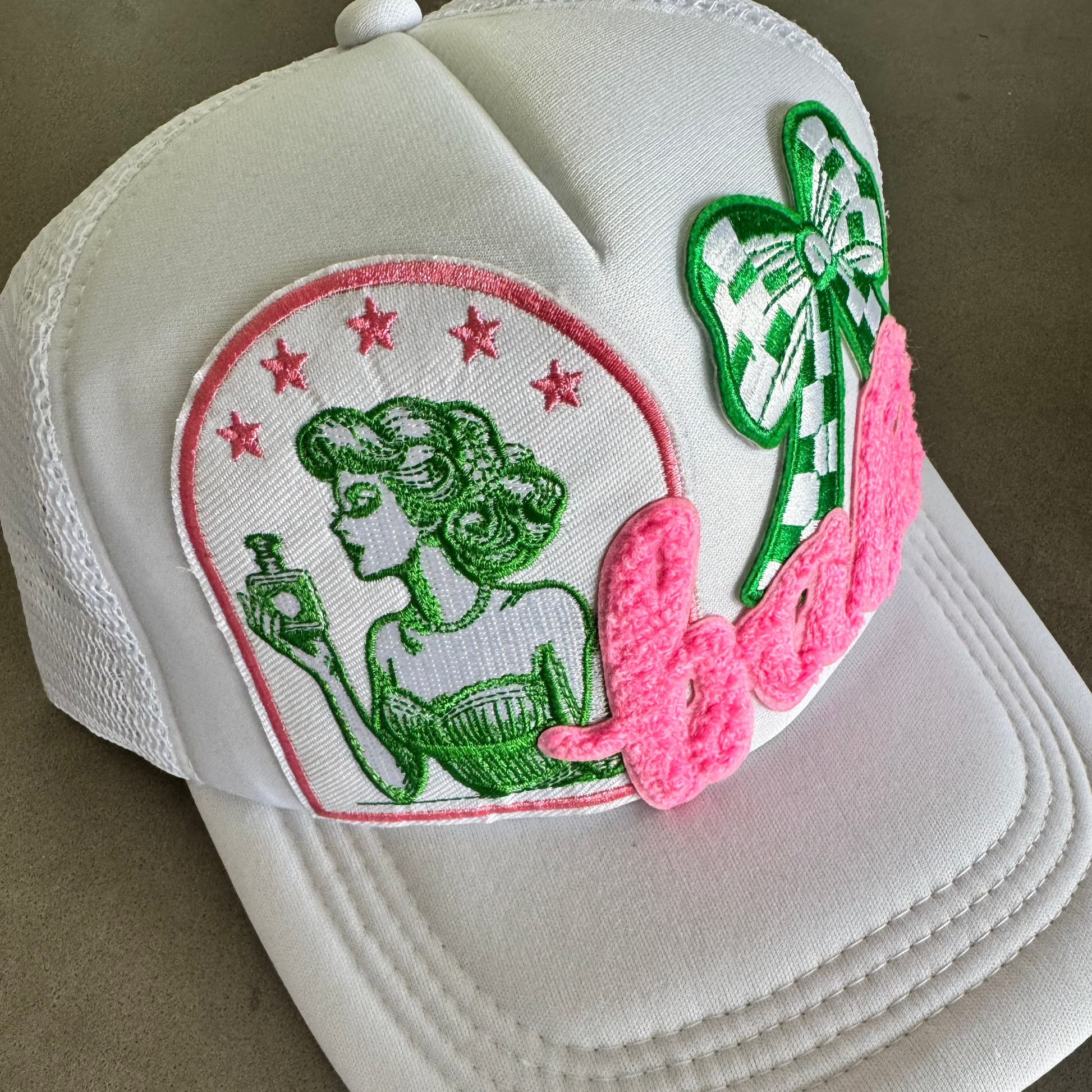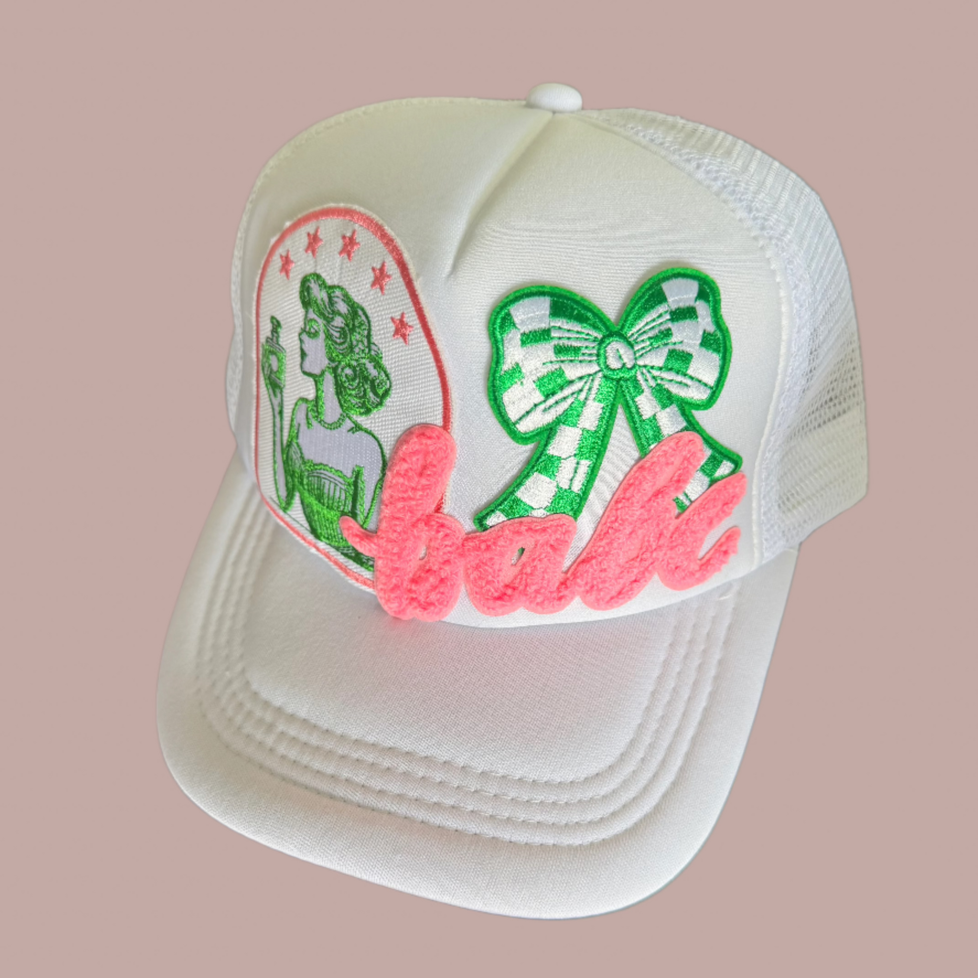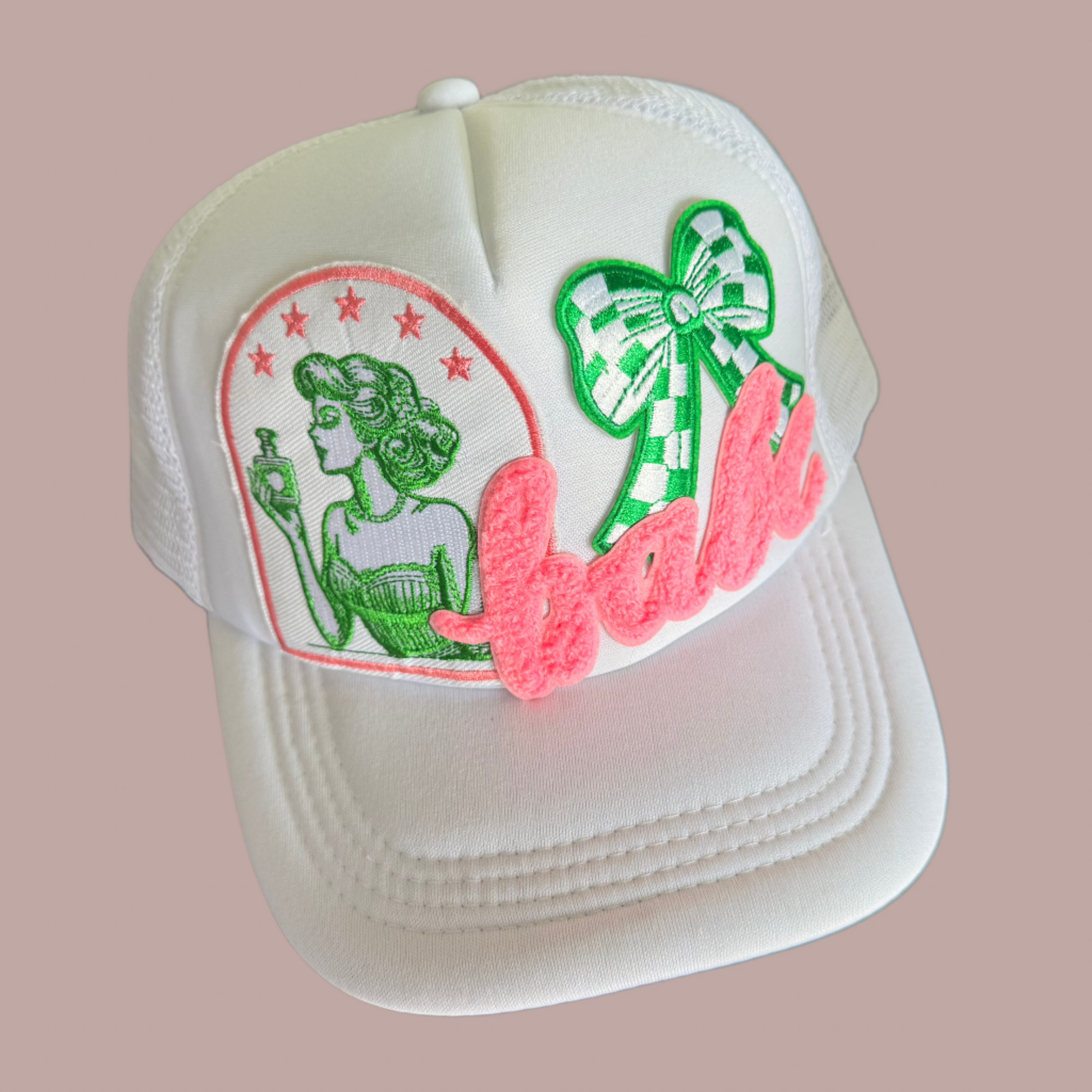 TOTAL BABE! This white trucker hat with a hot pink chenille 'babe' patch and green accent patches is a go to staple!