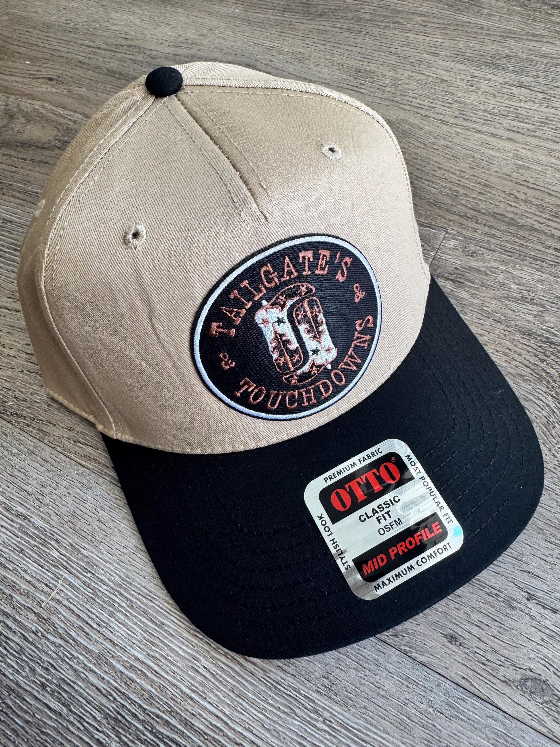 Show up in style this football season with the Tailgates & Touchdowns patch hat — the perfect mix of sporty and casual. This two-tone cap features a tan crown with a black bill and an embroidered patch that celebrates everything we love about game day: good friends, cold drinks, and touchdowns and of course a touch of western flair - cowboy boots!