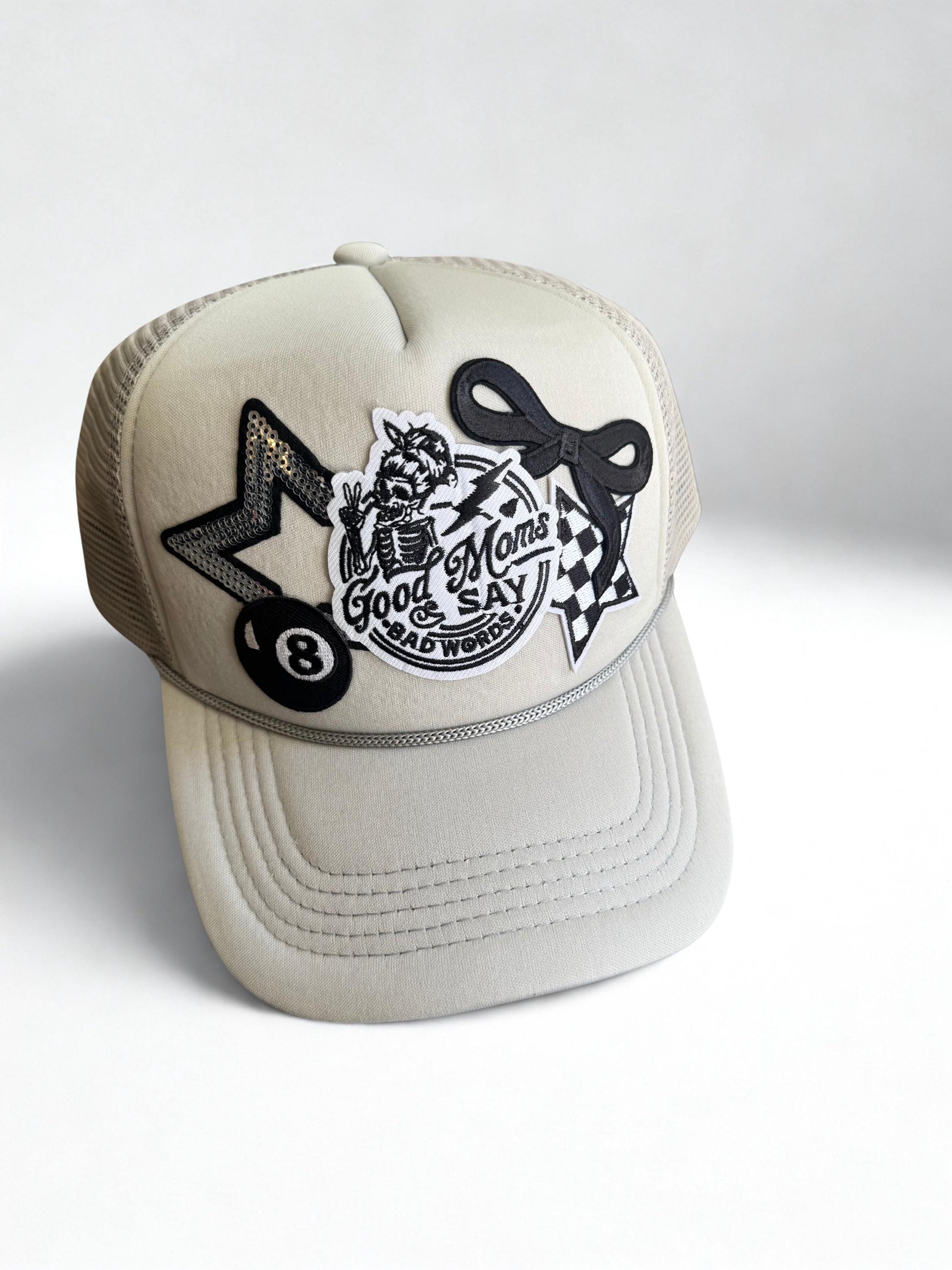 Bring a little sass and style to your outfit with this fun “Good Moms Say Bad Words” trucker hat. This grey foam-front cap is decorated with a bold mix of black-and-white patches — including a cheeky skeleton graphic, lightning bolt, bow, and racing flag — giving it a perfect blend of edgy and playful.