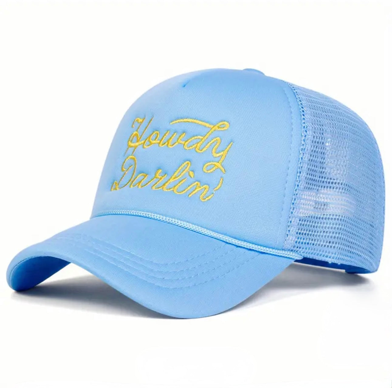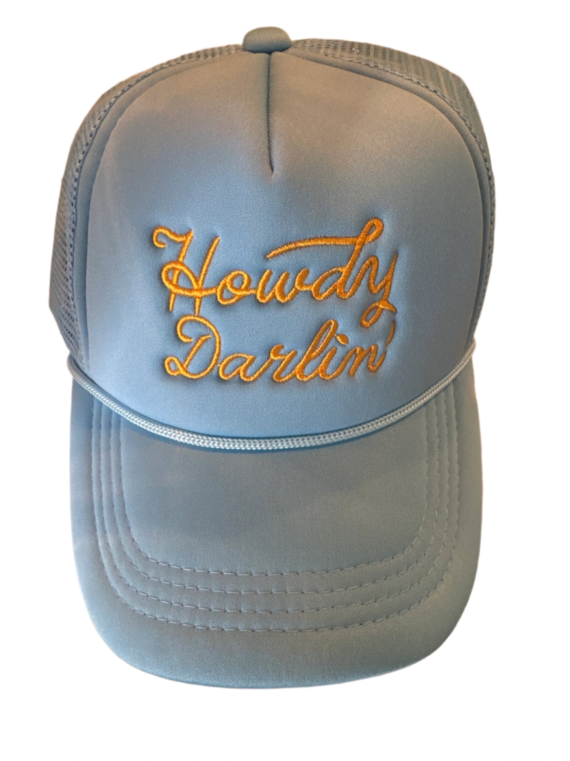 Embrace classic western style with the Howdy Darling embroidered trucker hat. Crafted for durability and comfort, this hat features detailed embroidery that adds a distinctive western flair touch to your look.