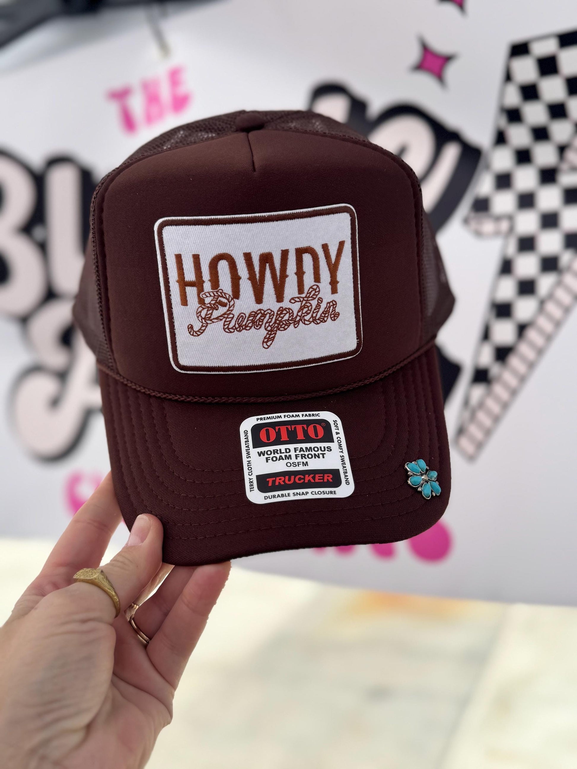 Y’all ready for pumpkin season? 🍂 This Howdy Pumpkin trucker hat is the ultimate mix of western charm and cozy fall vibes! Designed on a rich chocolate-brown foam front with a white embroidered patch that says “Howdy Pumpkin” in rustic brown thread, this hat is perfect for your next pumpkin patch day, rodeo, or fall road trip.