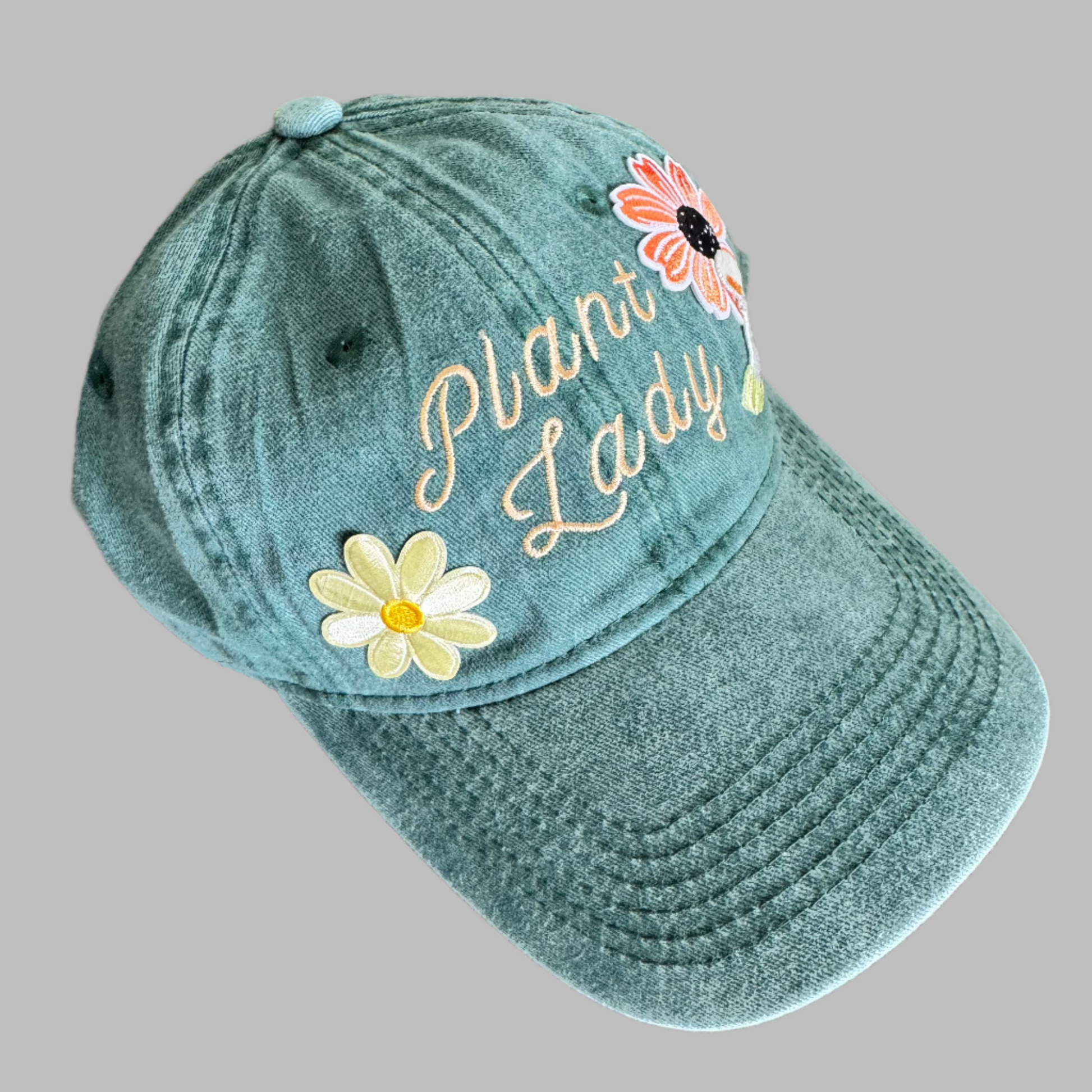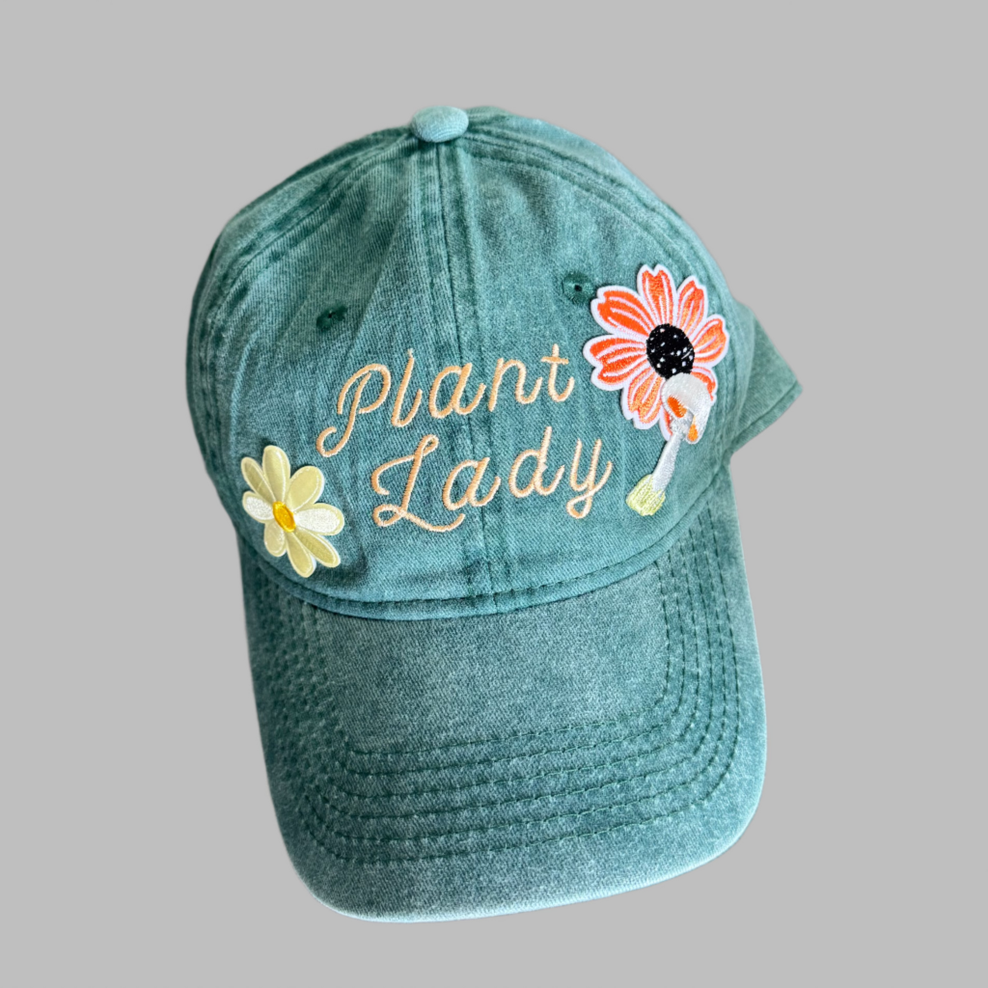 Where's all my green thumbs at? This darling green hat with embroidered "plant lady" adorned with flower and mushroom patches is PERFECT for you!