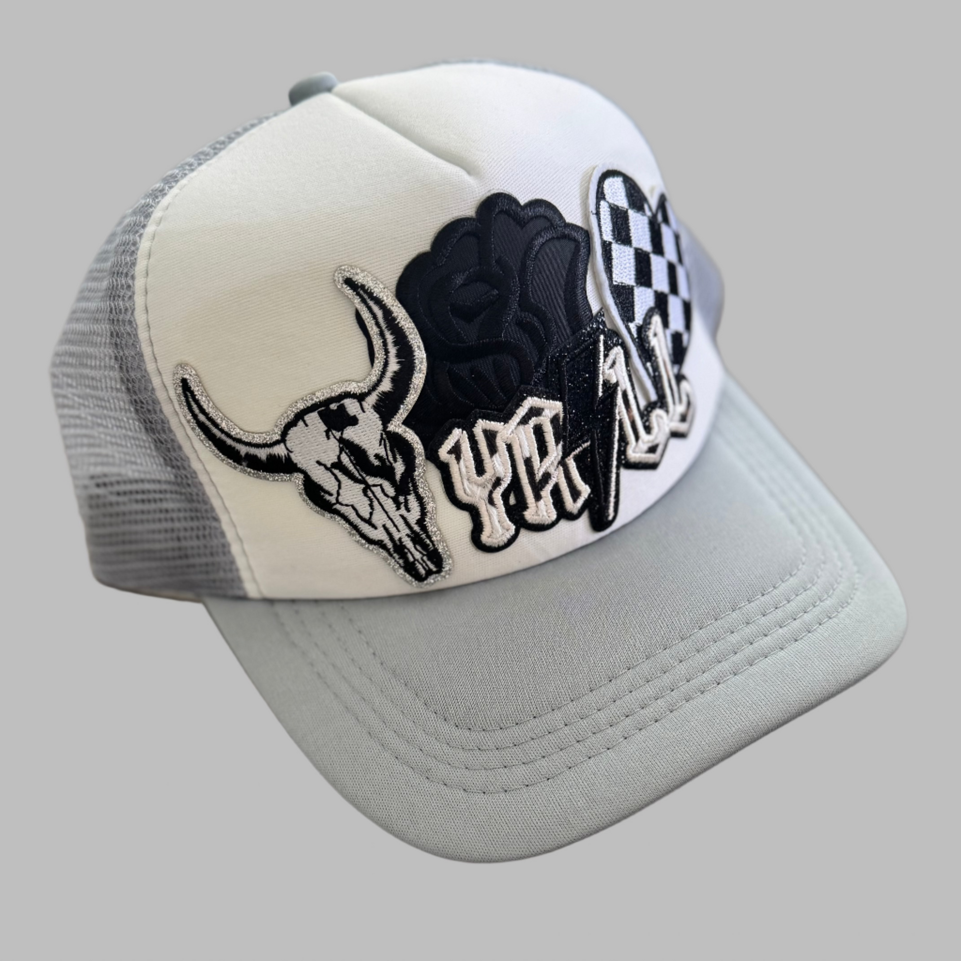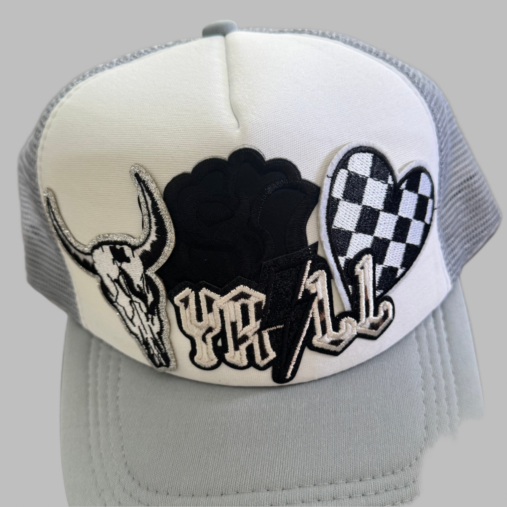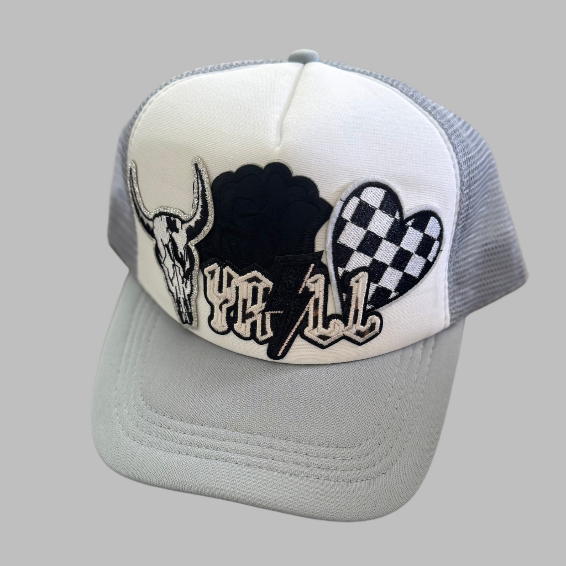 black and white western style ya'll on a grey trucker hat